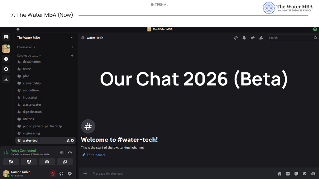 The Water MBA is currently operating in “exploration mode,” focusing on identifying amazing professionals, case studies, and topics globally to collect pieces of knowledge and foster interaction, operating without pressure or urgency.