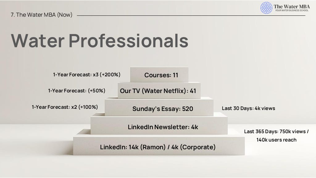 That’s why I asked the audience for help by sharing published content, engaging, and providing feedback on specific needed topics, emphasizing the “network effect”—recommending the Water MBA to others is crucial for growth.