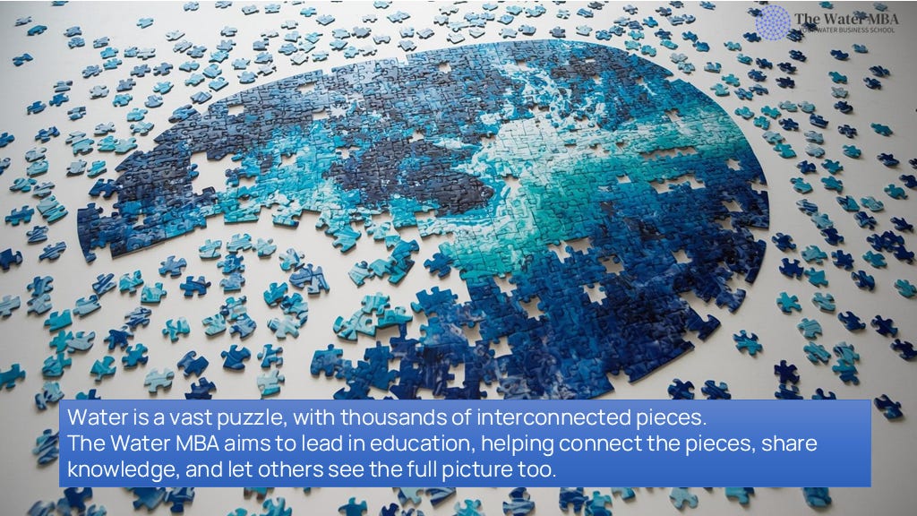 The goal of the Water MBA is to collect these pieces, understand how they connect, and share this comprehensive knowledge so professionals can make better decisions supported by the full picture.