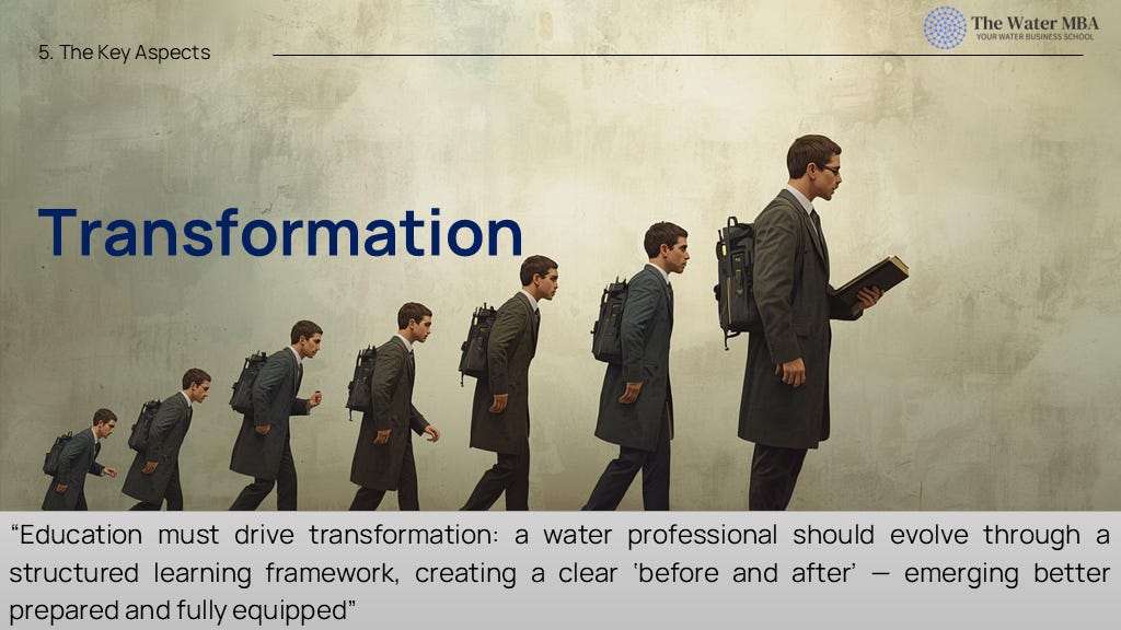 Consistency: Consistency is necessary to develop a learning habit; progress requires continuous effort, not just a single, fast-track course. The Water MBA attempts to share content weekly to promote this consistency.