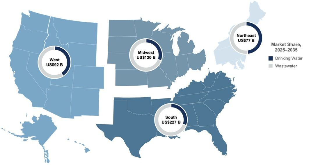 “US$515 Billion by 2035 — that’s the projected capital expenditure for water and wastewater treatment infrastructure in the U.S., according to the latest Bluefield Research report: https://lnkd.in/dZ44FTN6. A staggering figure, but one that reflects the scale of the challenge ahead.