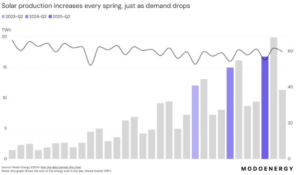 And high hydropower output in recent springs has added further supply, concentrating competition among renewables in the same hours.