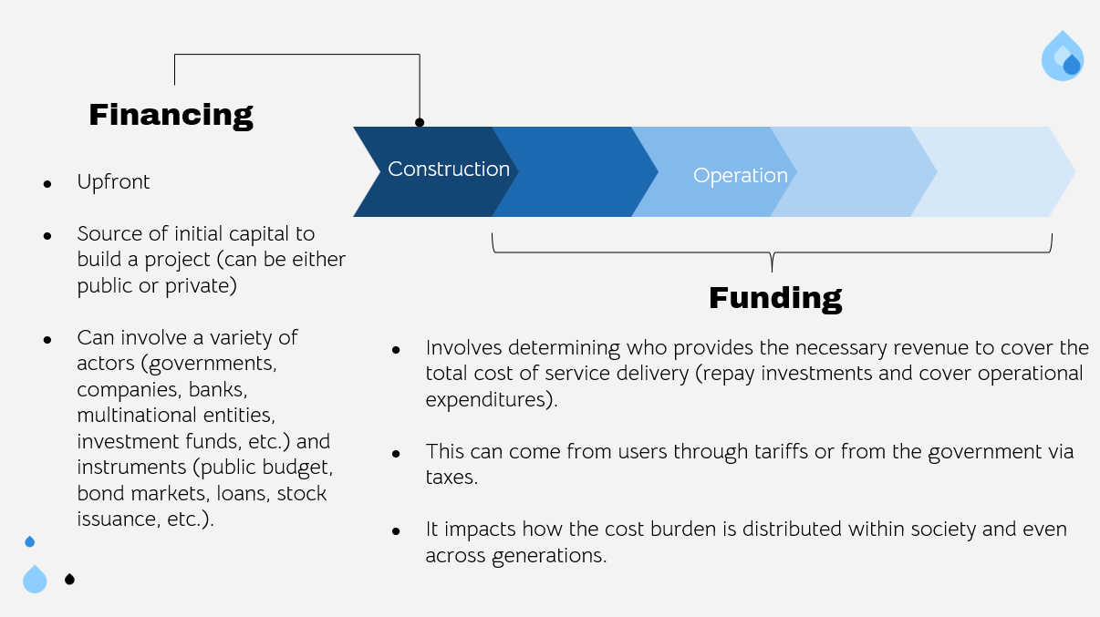 Financing is the upfront money needed to build a project. This can come from the government, but it can also come from private loans or bonds. Funding is how you pay that money back over the life of the project.