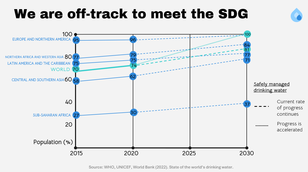 We all know the official data, right now, about 2 billion people still lack safely managed drinking water. In 2015, the world set a goal to reach 100% coverage by 2030, but we are falling behind. If we maintain the current trend, we will only reach 81% by that deadline.