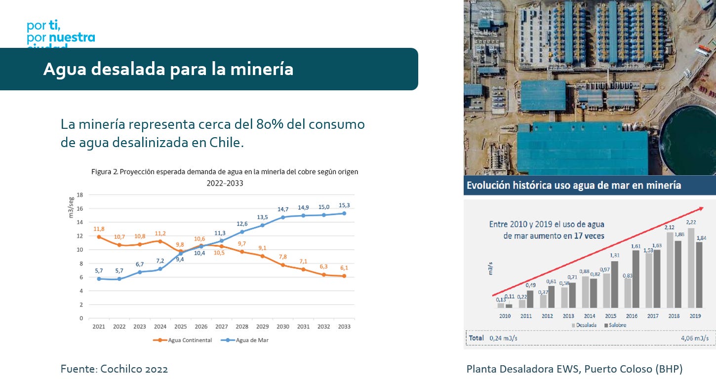 Mining industry has progressively increased their water demand from conventional resources to seawater resources, multiplying x17 times the use of seawater from 2010 to 2019, and the forecast is expecting to keep growing up to 2033 as shown in the bottom left graph.
